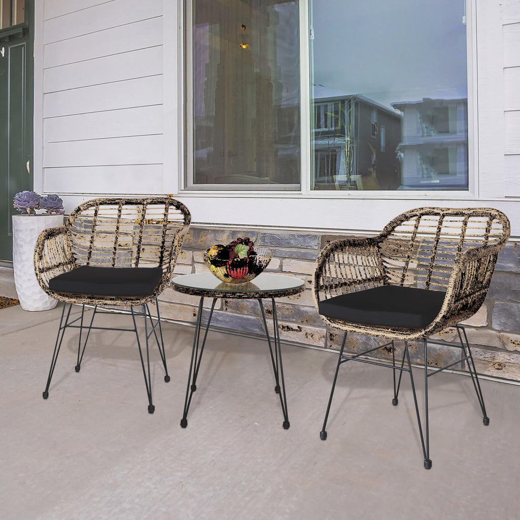 Do you need a Rattan Patio Conversation Set to fulfill all your daily needs? If so, you can have a try of our 3 pcs Wicker Rattan Patio Conversation Set with Tempered Glass Table. It is made of very durable and completely weatherproof rattan. Featuring sturdy construction and durable use, this patio outdoor wicker can well stand for both test of time and high temperature, which is perfect for any outdoor and indoor use and fulfills your purpose to decorate the place you desire. This outdoor set consists of 2 armchairs and a round table, which can be used for small decorations, snacks and drinks. Carefully hand-woven, all-weather wicker on the powder-coated steel frame to ensure long-term use. What do you hesitate for? Hurry and place an order!