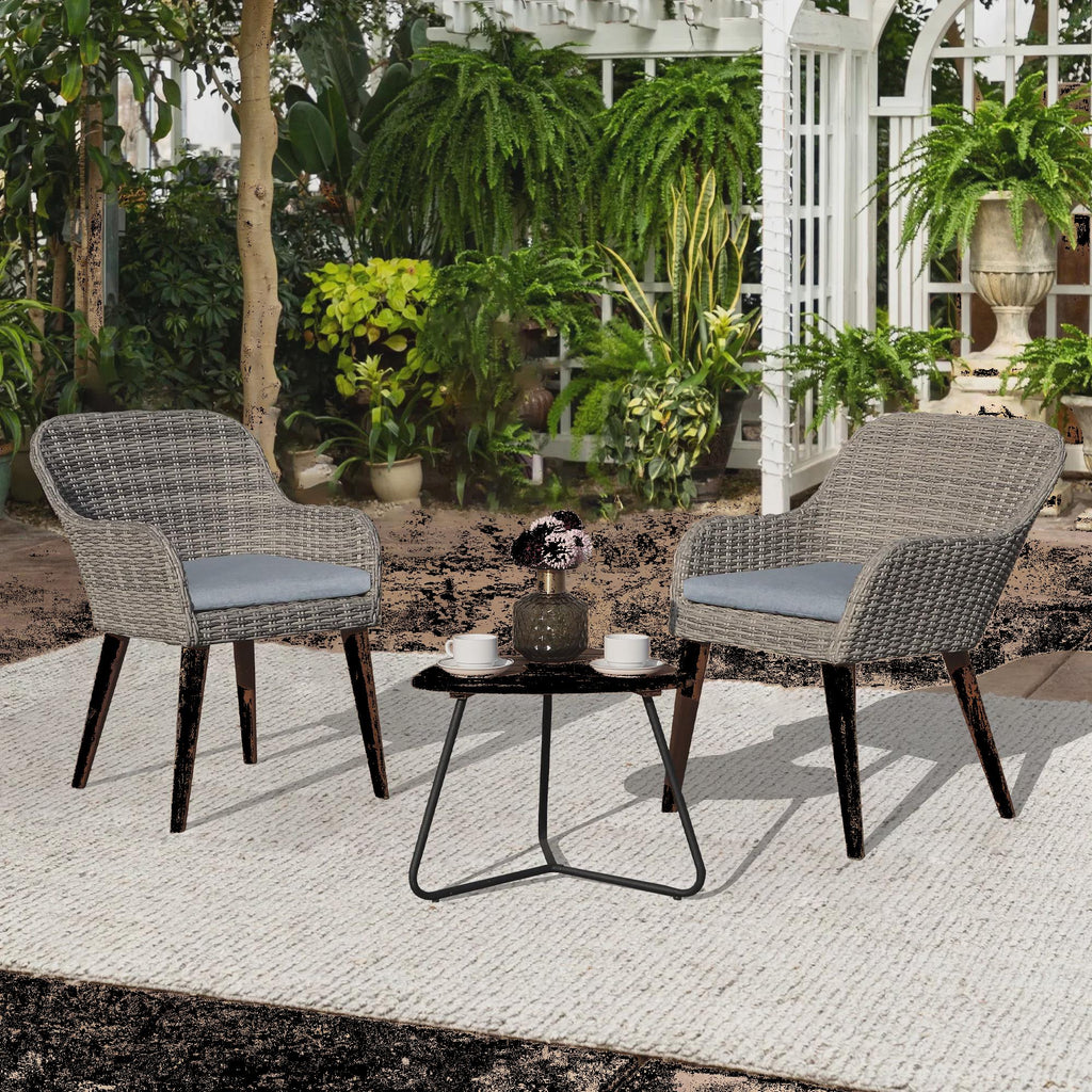 - Modern Design - This 3 piece set includes 2 armchairs and 1 side table, The ingenious combination of rattan weaving and wood makes this bistro set elegant and modern, creating a wonderful place for comfort and entertaining. The wicker chairs with seat cushions for added comfort.