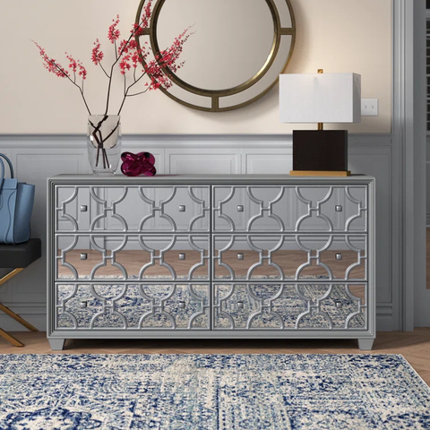 This 6-drawer double dresser features chic details on its drawer fronts that give your space a glam look and feel. Its clean-lined rectangular silhouette is made from a mix of solid and engineered wood in a variety of neutral hues to choose from. The drawers feature a reflective surface with a lattice-style fretwork overlay for a shiny touch. Each drawer opens up to reveal space for clothes, delicates, and extra blankets. Plus, this dresser's surface gives you plenty of room for a lamp or framed photo.