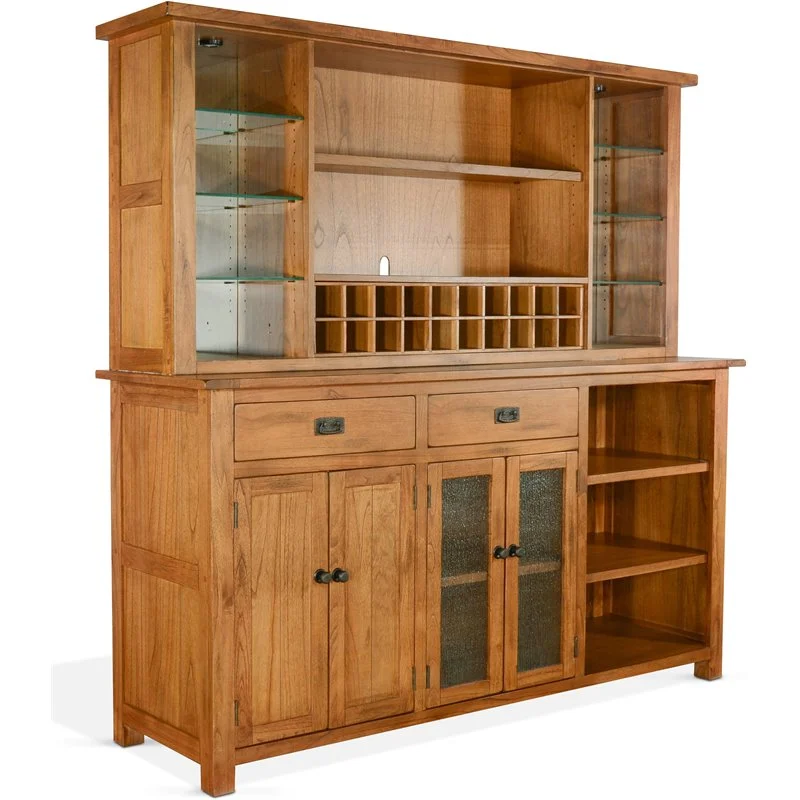 Add style to your entertaining area with the buffet and hutch bar. With ample space and easy accessibility, storing your favorite beverages and drinkware has never been easier. Constructed with mindi solids and veneers in a beautiful rustic oak finish.