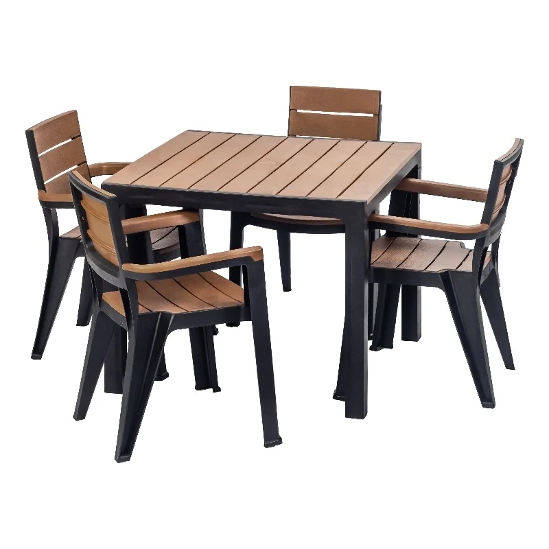 The Inval Madeira 4 Seat Dining Table and Chair Set by MQ finished in Black/Teak Brown is ideal for indoor or outdoor use. The table and chairs are constructed from high-density, industrial resin which is extremely durable as well as heat, stain, scratch, weather and UV resistant. Their nonmetal construction is also rust proof. The table’s top features a slatted design with a wood-like textured finish. It also features a standard center opening (1.63”/4 cm diameter) with removable cover that accommodates a standard shade umbrella (not included). Table legs feature adjustable feet. The chair’s seat and back feature a slatted design with a wood-like textured finish. The arms also feature this wood-like textured finish. Chair legs have non-slip feet for added safety. While this set looks and feels like wood, it is more practical, durable and eco-friendly. It is also very low maintenance and easy to clean. The casual yet stylish design is perfect for any patio, terrace, balcony or dining space. Overall table dimensions are 35” D x 35” W x 29” H (89 cm D x 89 cm W x 74 cm H) with a weight capacity of 132 lbs. (60 kg). Overall chair dimensions are 21.7” D x 23.2” W x 33” H (55 cm D x 59 cm W x 84 cm H). Seat dimensions are 17.3” D x 17.9” W x 17.5” H (44 cm D x 45.7 cm W x 44.5 cm H). Chair has a weight capacity of 265 lbs. (120 kg.). Table - easy assembly required, Chair – No assembly needed. Manufacturer’s 1-year limited warranty is included.
