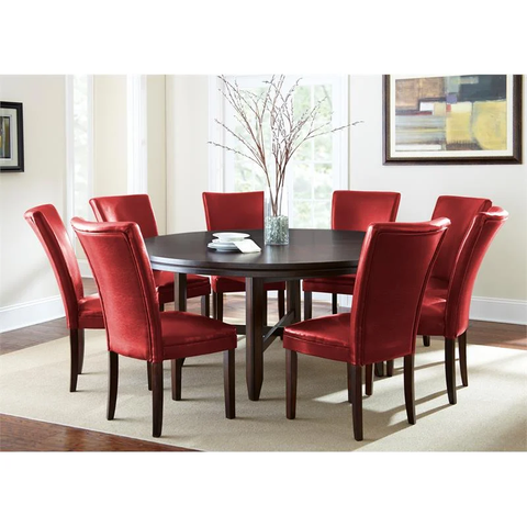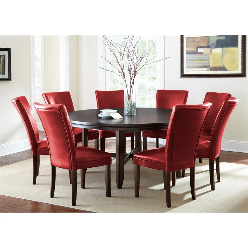The Hartford Dining Collection is the essence of comfortable contemporary style, designed to bring out the best in dining spaces of all sizes. Made of hardwood solids and oak veneers with a dark oak wood finish, the 72” round dining table has a unique double top design with decorative oak veneers and seating for up to eight. The optional 40” Avenue clear glass lazy susan simplifies serving (sold separately). Match with the bonded leather upholstered counter chairs, available in red and brown. This set includes one (1) 72-inch round dining table and eight (8) red side chairs.
