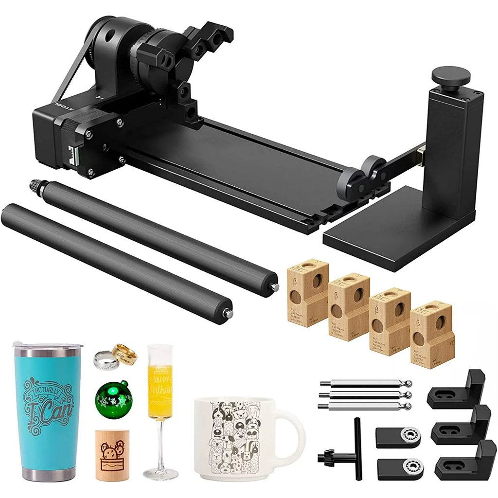 - Suitable for 90% Daily Use Cylindrical Object: xTool RA2 Pro is the WORLD'S FIRST 4-in-1 laser rotary attachment, including Roller Rotary, Chuck Rotary, Sphere-Engraving Module and Ring-Engraving Stud. You can unleash your creativity on almost all cylinders by changing accessories, such as wine glass, yeti tumbler, baseball bat, ring, ball, or mug with handle
