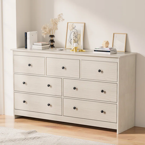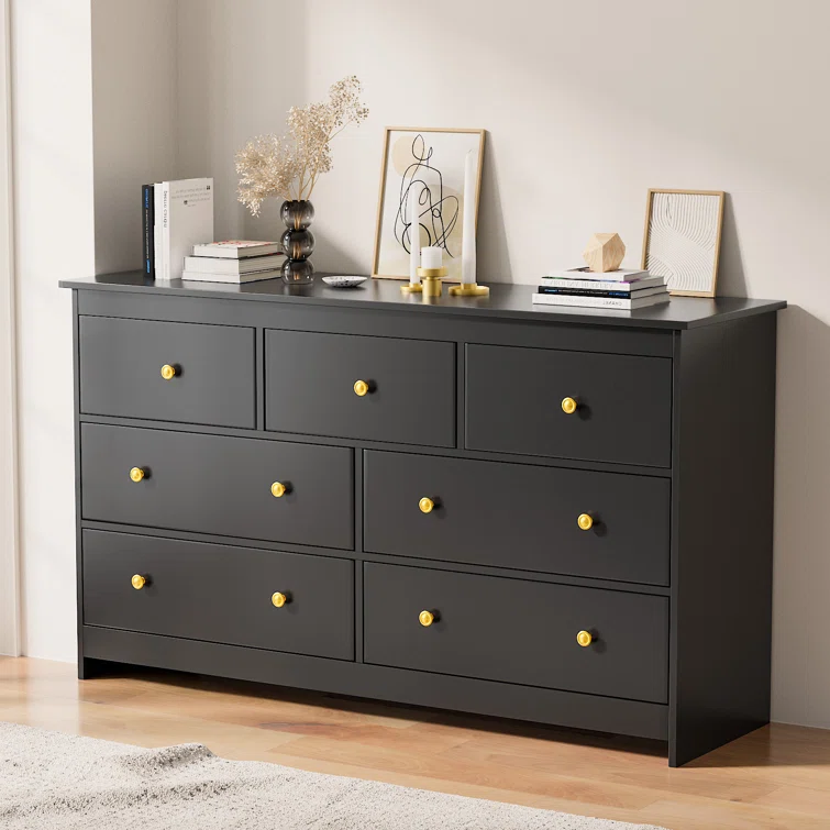 - Upgraded Storage Space: The overall size of the 7-drawer dresser is 55.1” L x 15.8” W x 32.3” H. Extra long design, with 7 deep and wide drawers, this dresser provides ample storage for all your clothing and accessories. You'll have plenty of room to neatly organize your belongings, freeing up closet space and reducing clutter in your bedroom. Each drawer can be opened up to 4/5, which is convenient for opening and utilizing all of the space.