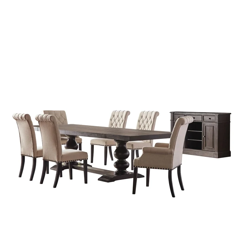 - Includes: One (1) dining table, four (4) side chairs, two (2) arm chairs and one (1) server