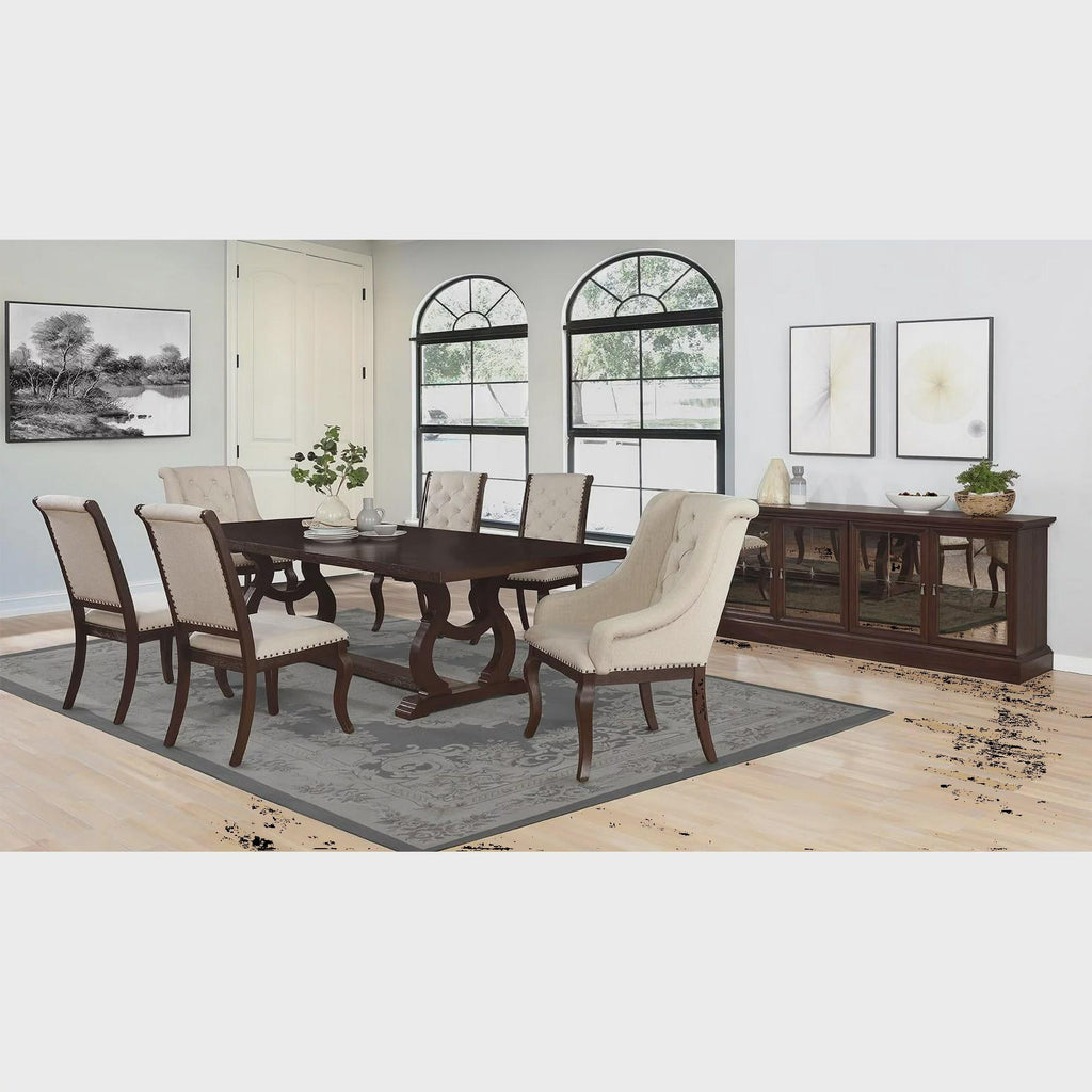 - Set includes: One (1) dining table, four (4) side chairs and two (2) arm chairs