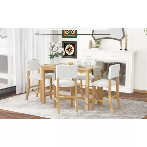 Add an air of elegance to your space with this classy 5-piece dining table set including one wooden counter height table and four cushioned chairs with nail head trim in an eye-catching and contemporary espresso and beige color scheme. Enjoy meals with family or gathering around the table and entertaining guests and relax with the 3.9 inch thick seat, cushioned curved backrests upholstered in velvety soft linen-like material offering the utmost support, alongside the base cross bars for a place to set your feet for your comfort.