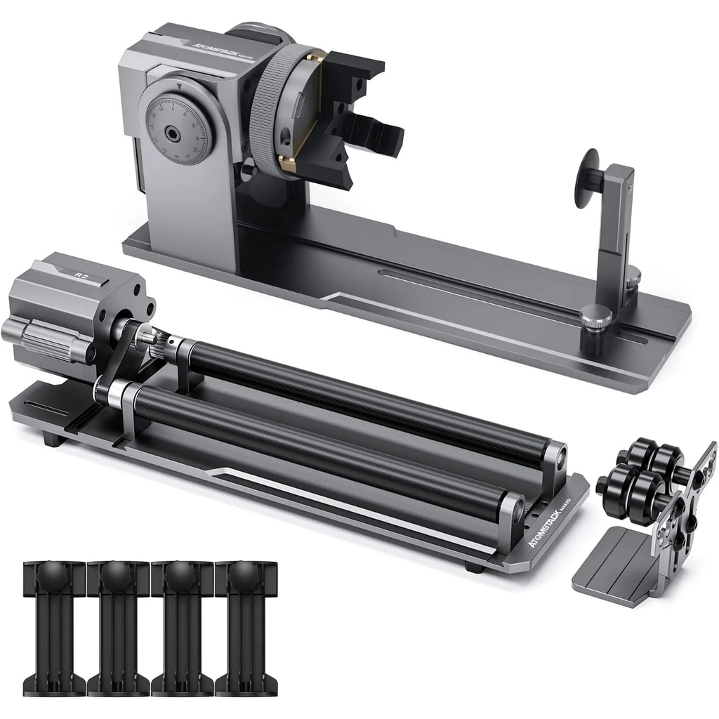 - Expansion of use scenarios: Inspired by industrial engraving machines the AtomStack maker R1 Pro multi-functional claw disc roller can break through the limitation of the plane and easily perform laser engraving on the surface of various special-shaped objects;
