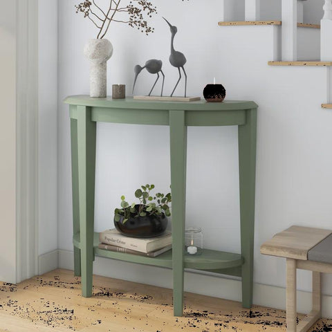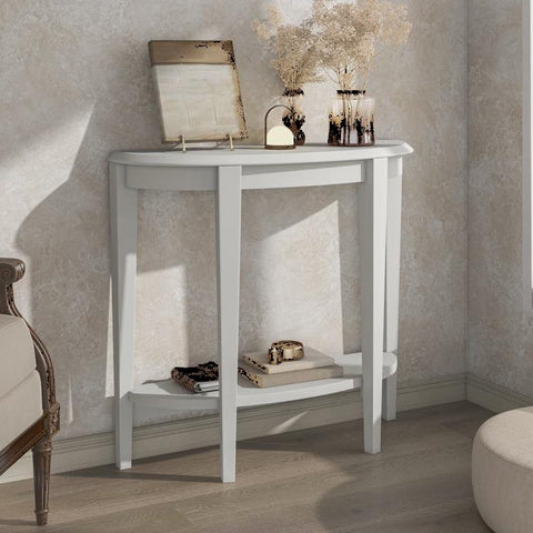 Upgrade your entryway with our half-round console table in a delightful color! Its half-round table design adds a touch of sophistication, setting the stage for a warm and inviting ambiance. Display your favorite décor and family photos on the two spacious shelves. This chic and versatile console table complements any room, bringing elegance to your home décor.