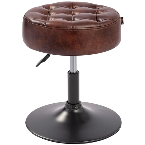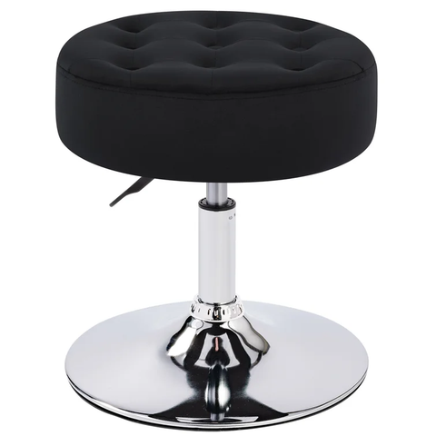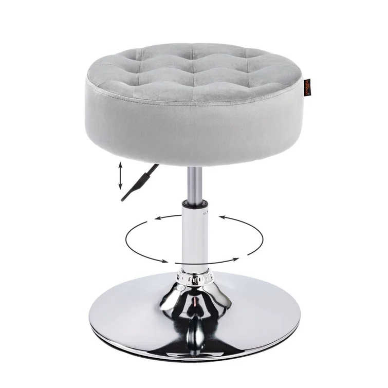 Mid-century Tufted adjustable swivel makeup stool. This perky vanity stool accessory is for your dressing area, bedroom, or main living space. The pedestal base is made from iron with a gleaming chrome finish, and it has an anti-slip rubber ring underneath to ensure stability and protect your floors. The foam-filled tufted seat is wrapped in velvet/PU that feels soft and looks luxe. And, its backless design means it tucks away easily for space-saving efficiency. We love that this office stool is height adjustable and swivels, so you can position it any way you like. Consider a pair for your counter-height.
