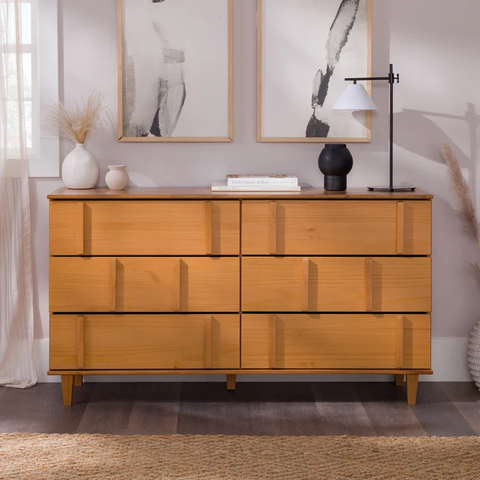 - Vertical wood detailing on drawers acts as modern drawer pulls
