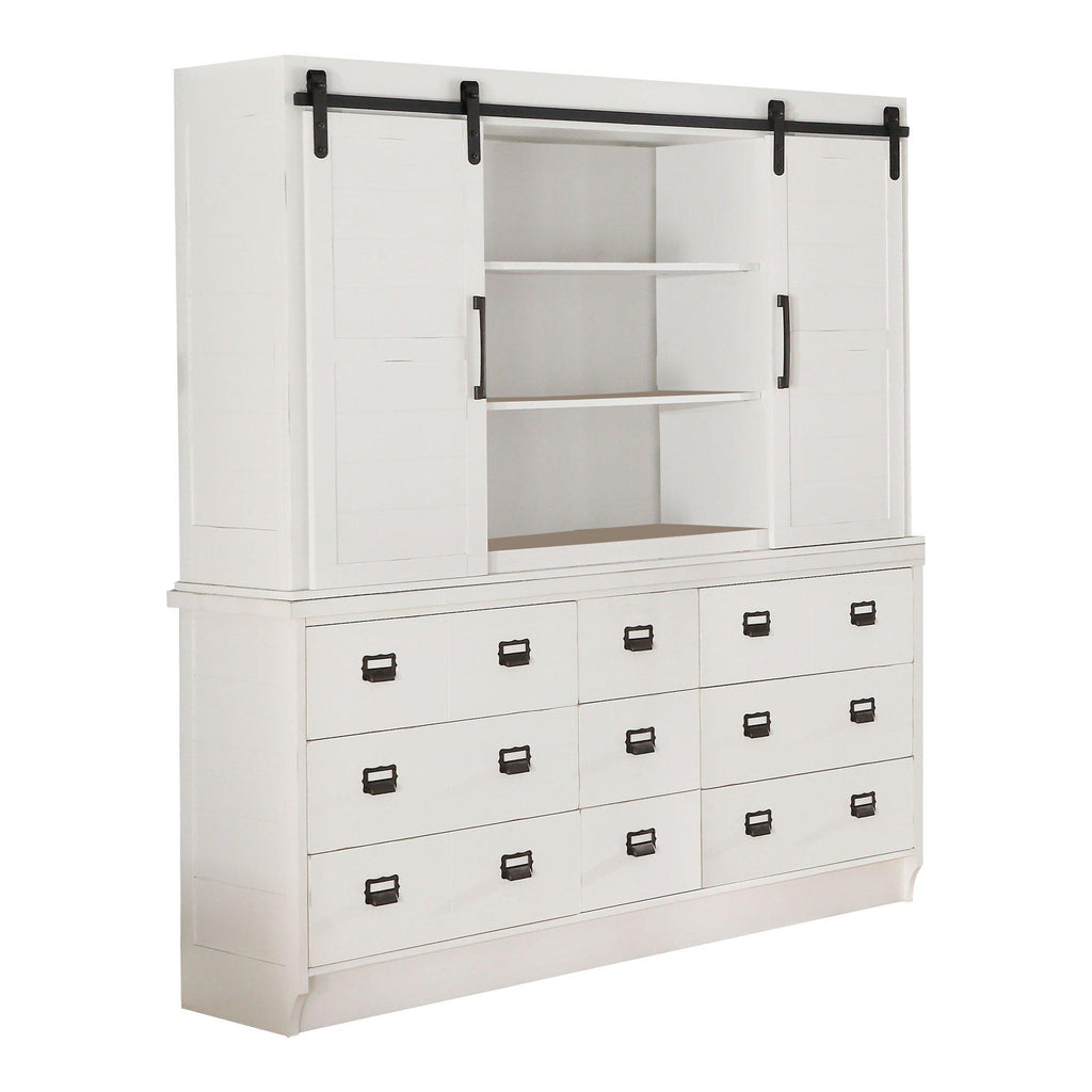 - It features nine drawers, two barn sliding door cabinets and six open shelves.