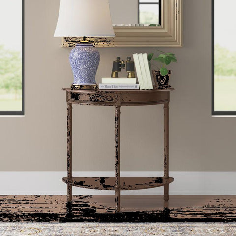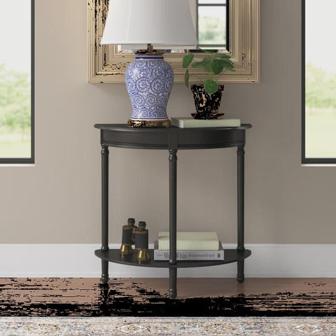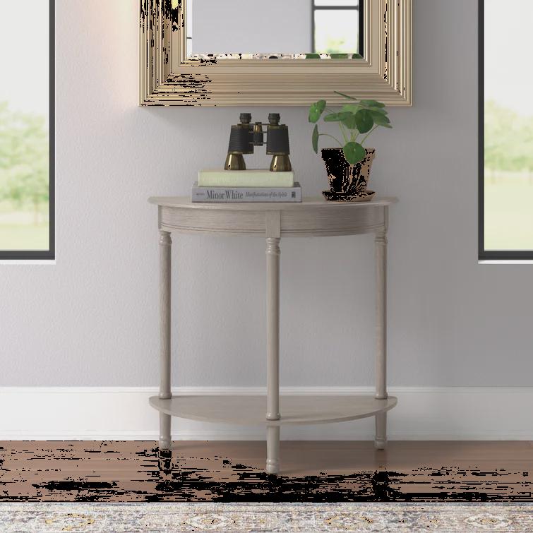 This console table has a smaller size that makes it ideal for rooms with limited space, such as an entryway of an apartment or behind a sofa in the living room. It's made from solid and engineered wood with a half-round shape that fits cleanly against a wall. This table has three turned legs and carved accents that enhance its traditional appeal. Though small, there's plenty of space on the tabletop and the shelf near the base for a potted plant or a basket for keys and mail. Full assembly is required.