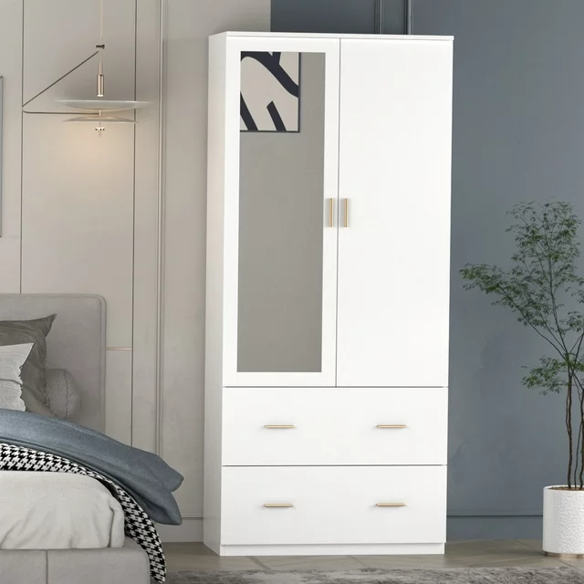 2-Door Wardrobe Armoire with Mirror and 2 Drawers is a must for any space-conscious bedroom. Heavy-duty garment rods and shelves behind two doors are perfect to hang your blazers, coats, and shirts. Two full-size drawers below the cabinet provide even more storage space to help keep you organized. The drawers come with metal runners and safety stops that will keep the drawer firmly in place when it is fully opened. Crafted of sturdy and fade-resistant melamine laminated engineered wood. This armoire blends well with both traditional and contemporary decors.