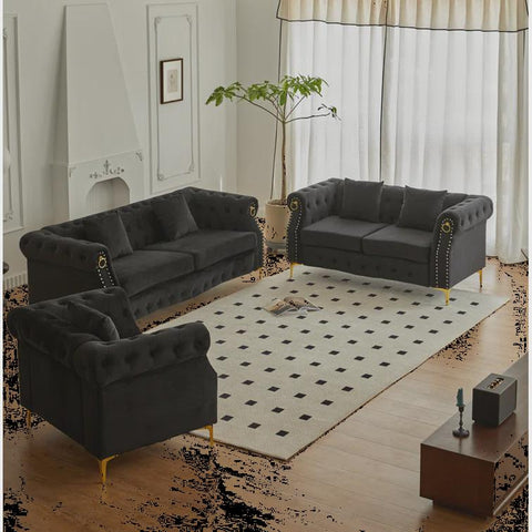- Chesterfield Style:The design of this group of seats is in the traditional Chesterfield style, with the prevalence of buttoned velvet upholstery, curled armrests, metal legs and decorative rivets.