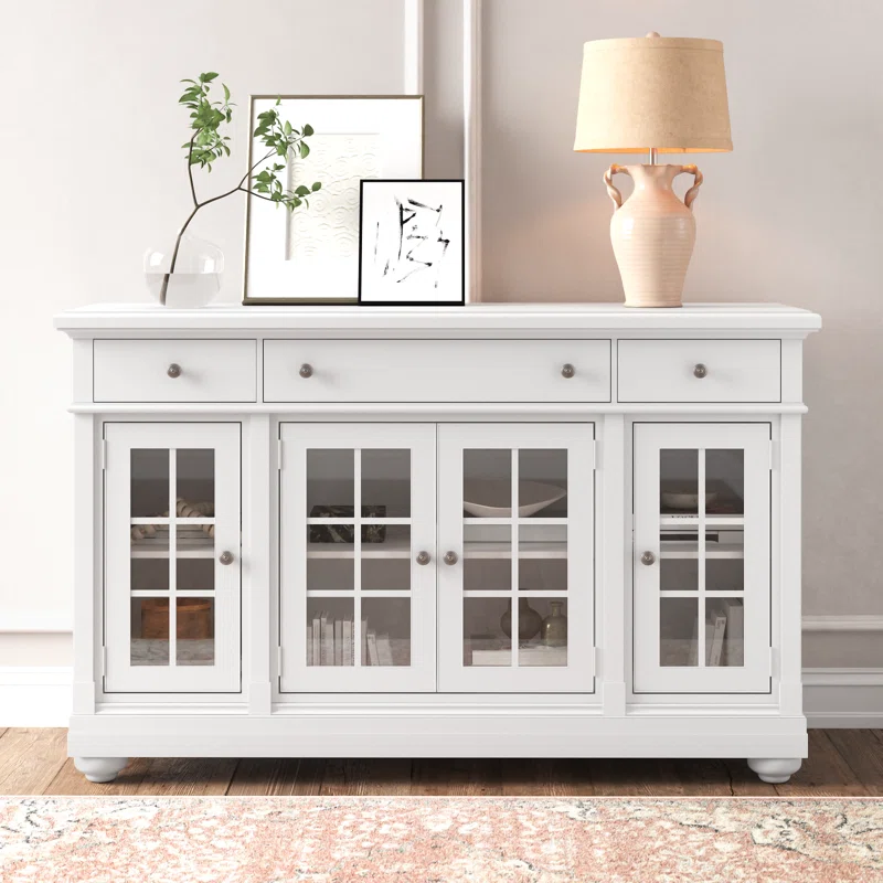 Far from just a dining room focal point, sideboards offer a convenient spot to serve charcuterie spreads, store fine china, and much more. Crafted from solid and engineered wood, this traditional buffet showcases four glass doors with three shelves behind each, perfect for showcasing your favorite dishware and storing tablecloths. Three drawers offer plenty of space to tuck away any loose items you don’t want on display, while its spacious 66-inch wide top provides a spacious stage for some decorative trinkets, framed photos, or a vase of your favorite flowers. Hand-curated by Kelly Clarkson.