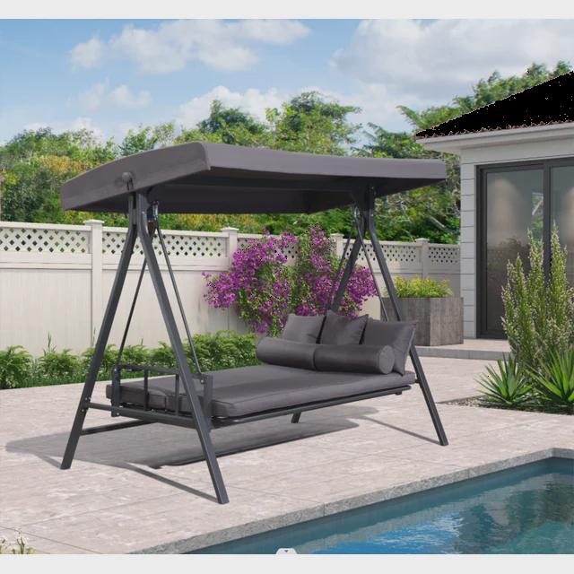 There's no better place to take a breather than your outdoor oasis. Want to experience the ultimate state of relaxation? Consider adding a porch swing. Believe us, rocking back and forth to the sound of nature, music, or loved ones is as close as it gets to pure bliss. Backrest is adjustable turning the swing-bench into a comfortable flatbed with a simple locking mechanism on the side. Bringing optimal comfort for outdoor enjoyment. Steel frame construction with weather-resistant finish ensures lasting use, for durability and low maintenance. Additional anti-slipping plastic end-ups improve stability and also prevent the floor from scratching. The canopy is made from polyester fabric that provides sunlight protection; the angle of the canopy can be adjusted by rotating the knob to get ample shade coverage against the sun all day. Includes 2 comfy roll pillows, perfect for adding extra cushioning to your armor back; 2 individual seat cushions provide a cushy place to sit back on the patio swing, Ideal for outdoor lounging. This outdoor swing is easy to assemble, you don't have to hang the porch swing to the ceiling joists and move it wherever you want, suitable to set on a porch, garden, backyard, or lawn.