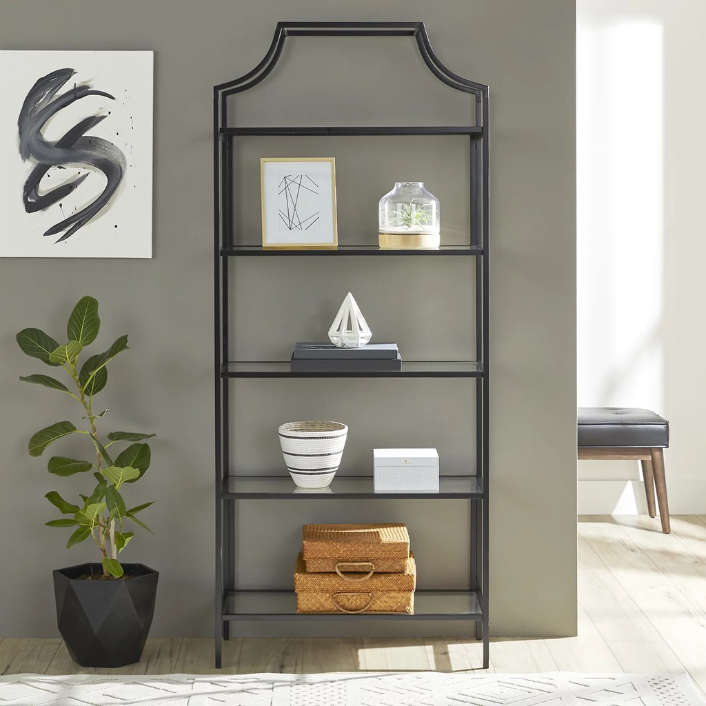 All that glitters is gold. Be a shooting star and break the mold by adding a touch of luxurious style to your living space with this sophisticated etagere bookcase from the Nola collection. This etagere bookcase features five open shelves, each with a safety-tempered glass surface that adds an extra pop of style to your home decor. These glass shelves make the perfect spot to store books, folders, and other around-home essentials. Switch it up and use it as a display area for pictures of your family, vases full of flowers, or any other of your life's most prized possessions. Its rounded edges and curved indent design give it a stunningly unique appearance that is sure to grab the attention of your friends and family. Constructed from sturdy metal and finished in gold, this sleek and elegant bookcase adds classic beauty to any room and will have you living in the lap of luxury. Make sure you check out the Better Homes & Gardens Nola collection for more great items!.