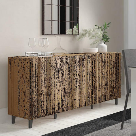 This versatile sideboard mixes materials and textures to create a striking look with nods to mid-century design. Made from engineered wood, this sideboard features a clean-lined silhouette with a neutral and natural finish. The shiny splayed metal legs layer in some material contrast and complement the finish of the surface. The body features a vertical plank design inspired by retro wainscoting, with interior shelves to tuck away dishes, books, and media items. We also love that the 75" wide surface is ideal for placing down a tray of apps during your next cocktail party and a vase of fresh flowers.