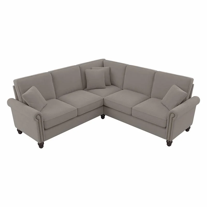 The Bush Furniture Coventry 87W L Shaped Sectional Couch presents a practical living room seating solution with remarkable quality and durability to match its classic style. Conveniently packaged for easy movement into any room or corridor, this ready-to-assemble L shaped couch is a great way to furnish a small apartment, large home and everything in between. Enjoy the company of friends and family or relax by yourself on a sectional sofa with high-density cushioning and pocket coil seat springs that maintain their feel for years of comfort. Reversible cushions feature pet-friendly StainGard(TM) fabric that repels dirt, oil, water and other liquids to prevent blemishes. The framework has a quiet sinuous spring design with cross supports that won't sag over time. This corner sofa has been rigorously tested for safety, durability and stain resistance and is backed by a 1 Year Warranty.
