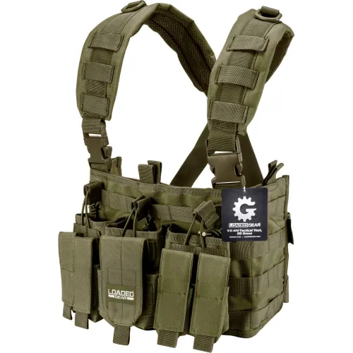 The Loaded Gear VX-400 Tactical Chest Rig from Barska (Green) is an essential piece of gear that keeps your accessories organized and close at hand. The VX-400 Chest Rig is equipped with 3 dual magazine pouches that can accommodate two standard 30 round magazines each, providing space for 6 magazines total. The Loaded Gear VX-400 can be adjusted to fit most adult sizes and features padded shoulder straps to maximize comfort. Features integrated MOLE System for attaching additional accessories.