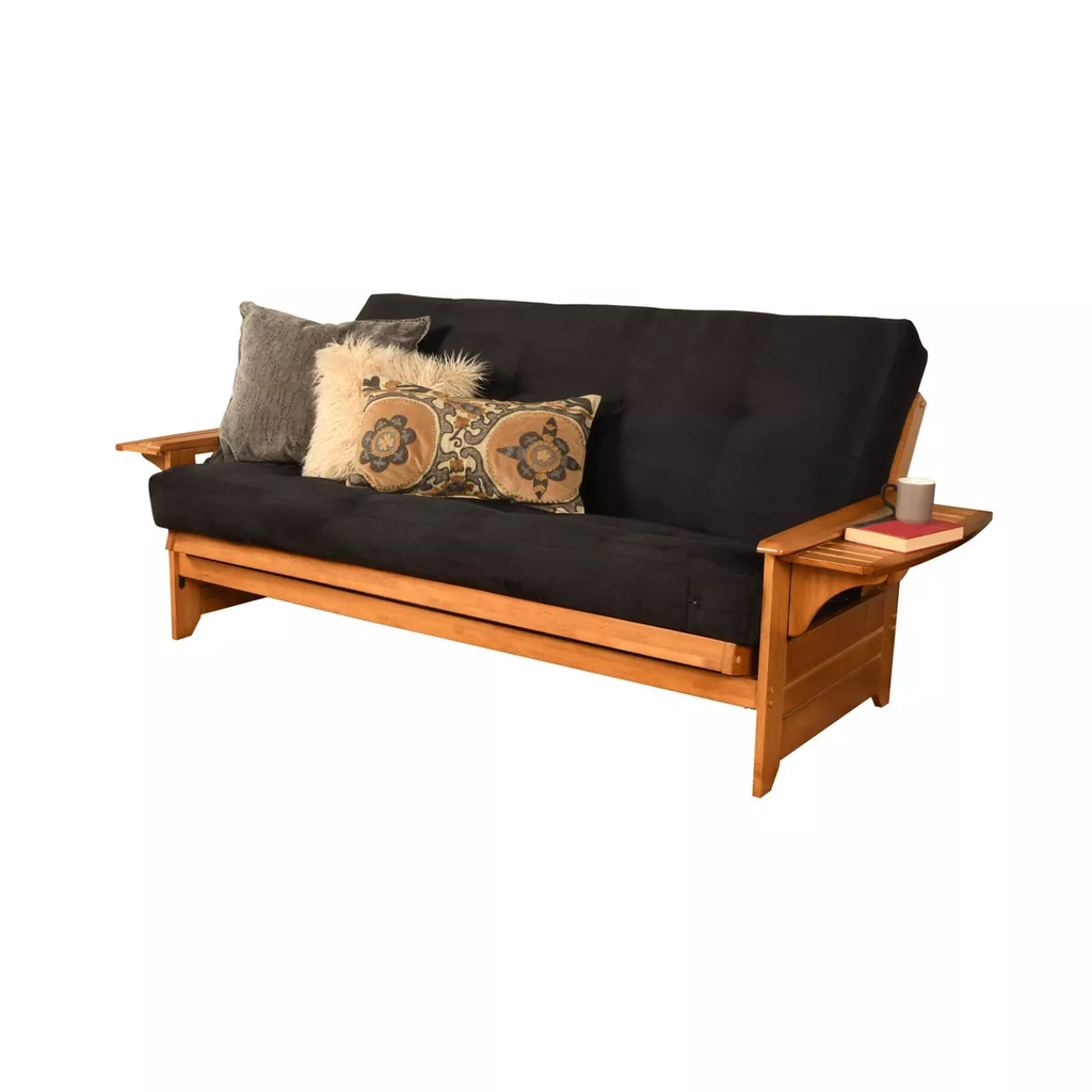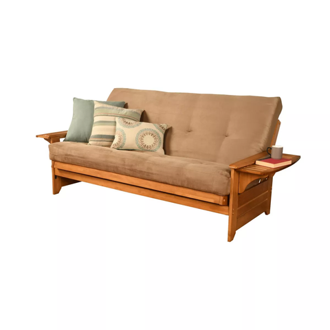 Exceptional function and artistry are featured in this solid wood Dual Comfort Wheaton Futon. This full-size futon is an excellent choice for a family room or game room. The convenient fold out arm trays of this piece will securely hold your snacks and drinks whether playing games or watching a movie. The futon mattress has a total of 276 hinged coil innersprings, covered with high density foam, and finished with decorative, tufted upholstery for softness and moldability allowing the mattress to rest in the perfect position every time. The clean, slat design and butternut brown color choice make this futon ideal for your home décor. This futon has two optional drawers for out-of-sight storage.