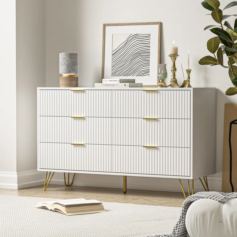 White dresser for bedroom Features: - 6 Deep drawers: Ample space for daily storage - Anti-tipping device: Prevent your kids or pets from the incident - Gold handles: Create a clean and spacious look in your bedroom or living room - Wide tabletop: Offers a decent place for your daily stuff Specifications: - Color: White - Material: Engineered wood - Overall dimension: 47.2" L x 15.7" D x 29.5" H - Weight capacity: 35 lbs in each drawer Package includes: - 1 x 6 Drawer dresser - 1 x Instructions - 1 x Hardware kit