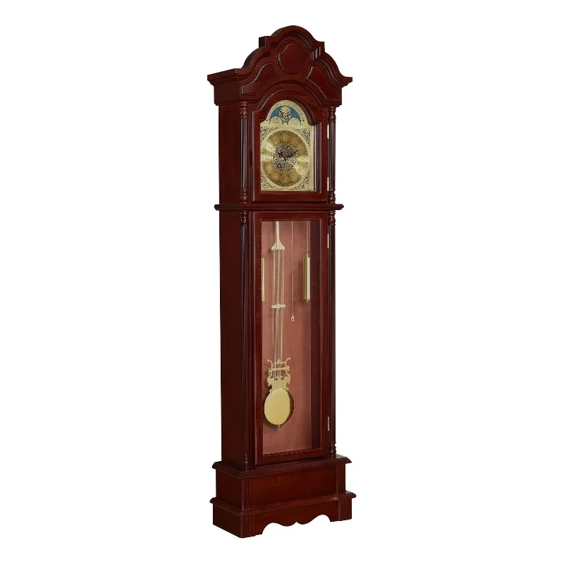 - Traditional grandfather clock in brown red finish with gold details and pink felt interior