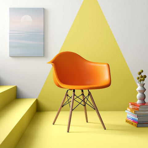 Add charm and presence with this aesthetically pleasing accent chair. Smooth, gentle curves provide style and conforms to your body allowing you to sit comfortably. The durable matte plastic molded chair and geometrically designed wooden legs add an artistic appeal. You can instantly modernize your living room, kitchen or dining room, mixing it up with different colors. The versatility of this chair will have you in the office negotiating deals and in the home kicking back spending time with the family. This graceful arm chair is well suited to complement any setting as a single chair or pair.
