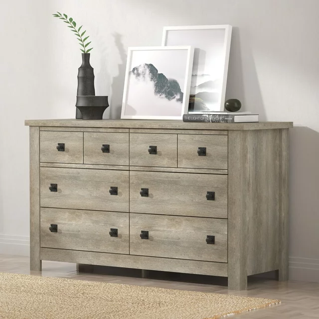 Modern farmhouse large dresser in a driftwood gray finish, 6 drawer dresser with faux 8-drawer design for ample storage, Assembly Required, 90-Day Limited Warranty