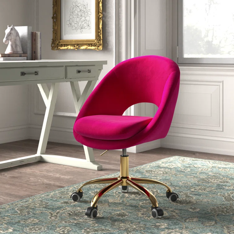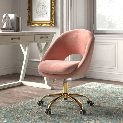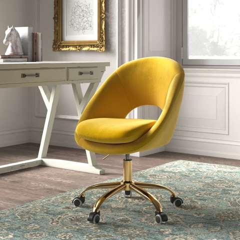 Modern and stylish, this desk chair is just what your home office needs. It showcases a rounded open back with sloping arms that curve around a rounded seat cushion. This chair is upholstered in velvet for a glam look and is available in a variety of solid hues to go with your existing color palette. Down below, five metal legs in a golden finish are capped off with casters that help you move from task to task with ease. Pair it with your favorite desk for a complete look. Hand-curated by Kelly Clarkson.