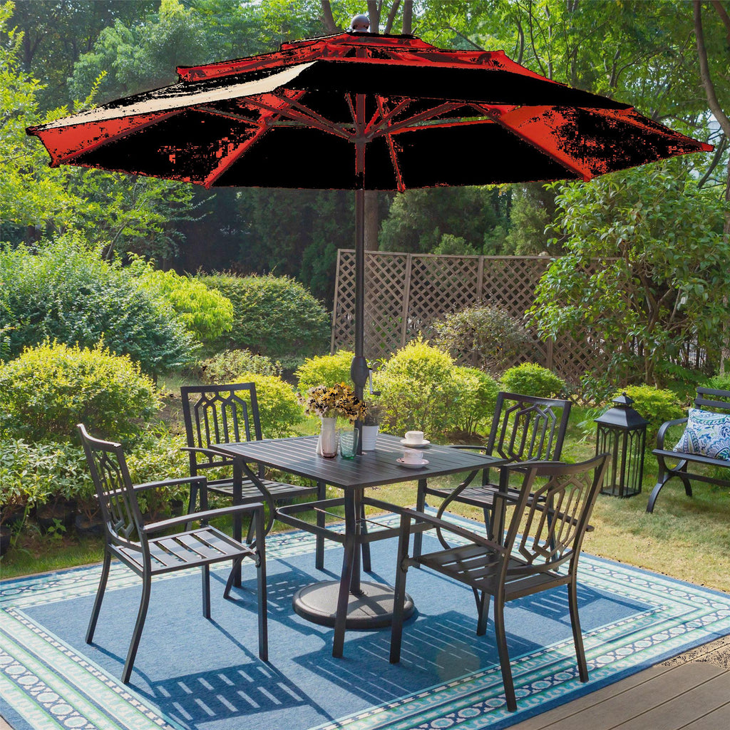 This  modern metal steel patio dining set is ideal for your family/friends gathering, party, dinner and conversation. It includes one square dining table, one 10 ft patio umbrella and four armchairs. Made of heavy-duty steel frame with excellent E-coating finish, it offers supportive structure and stands up to outdoor elements for reliable long-lasting strength. The chair features a clean-lined design of strips and slats with perfect powder coated finish for an elegant aesthetic that provides with nicely seating experience and will certainly decorate your patio&yard. Chairs can be easily stacked up and conveniently stored. The 10 ft umbrella is assembled onto the table top which has 3 tiers vented top that is conducive to air circulation and reducing sultry, keeping you cool and comfortable under the canopy in breeze. It is easy to open&fold up the umbrella by swiveling the crank handle and press the auto-tilt button on pole for a perfect shade direction. This MF Studio patio set is a gorgeous addition for summer. Don't hesitate to take them home.