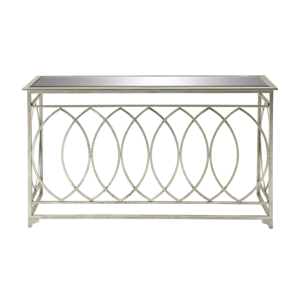- Metal silver console table has a rectangle mirror surface with oval metal structure in an open style frame