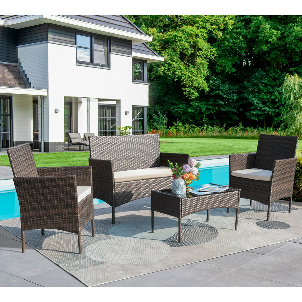 Lacoo 4 PCS Outdoor Patio Conversation Furniture Sets with Cushioned Tempered Glass. Traditional patio furniture is considered to be clunky, outdated, and unattractive, it's time to replace them with our stylish and affordable wicker sets of high-quality construction. We have been working closely with our manufacturers on a variety of 4-piece wicker sets that are stylish, easy-to-maintain, and versatile enough as to fit most of the space. This Lacoo 4-Piece Wicker Outdoor Patio Furniture set is made of strong steel frame with all weather PE rattan wicker. Excellent lounging choice for patio, porch, poolside or garden area. Easy assembly, no maintenance required, difficult to crack, split, rot, chip, fade or deteriorate. The cushion cover is also detachable. If you accidentally spill on your cushions or if dirt accumulates over time you can simply zip off the cushion covers and give them a quick wash to have them looking brand new.