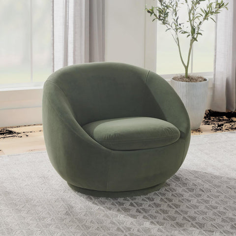 The Better Homes & Gardens Mira Swivel Chair, Olive, brings timeless style and cozy comfort to any room. Its versatile design complements living rooms, home offices, and beyond, with a luxurious green velvet fabric that exudes sophistication. Soft and supportive, the chair provides long-lasting comfort, while a sturdy solid wood frame ensures durability. The 360-degree swivel base facilitates easy conversation, and the chair arrives fully assembled for your convenience. Pair two chairs together for a comfortable conversation set.