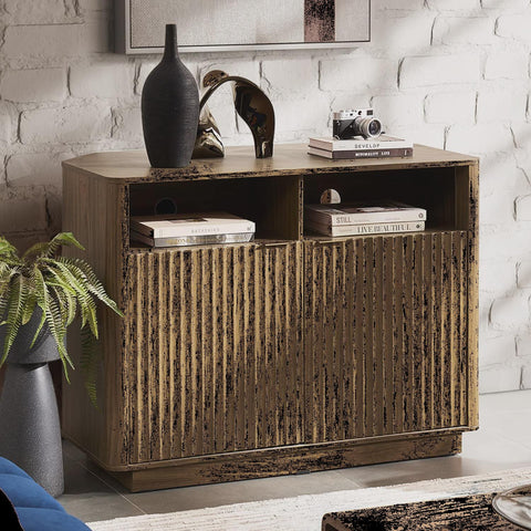 Our Mopio Brooklyn Storage Cabinet is a versatile piece that also works as a corner TV stand, flushed against the wall or in a corner of the entryway, living room, dining room. It is inspired by classic art deco and mid century modern styles, sporting a unique fluted panel design, curved sides and trendy rose gold aluminum handles for added sophistication. Featuring two open niches, and two push-pull doors, it conceals two adjustable shelves with 5 set positions inside for extra storage. The two media cutouts also offer clean cable management for use as an entertainment center.