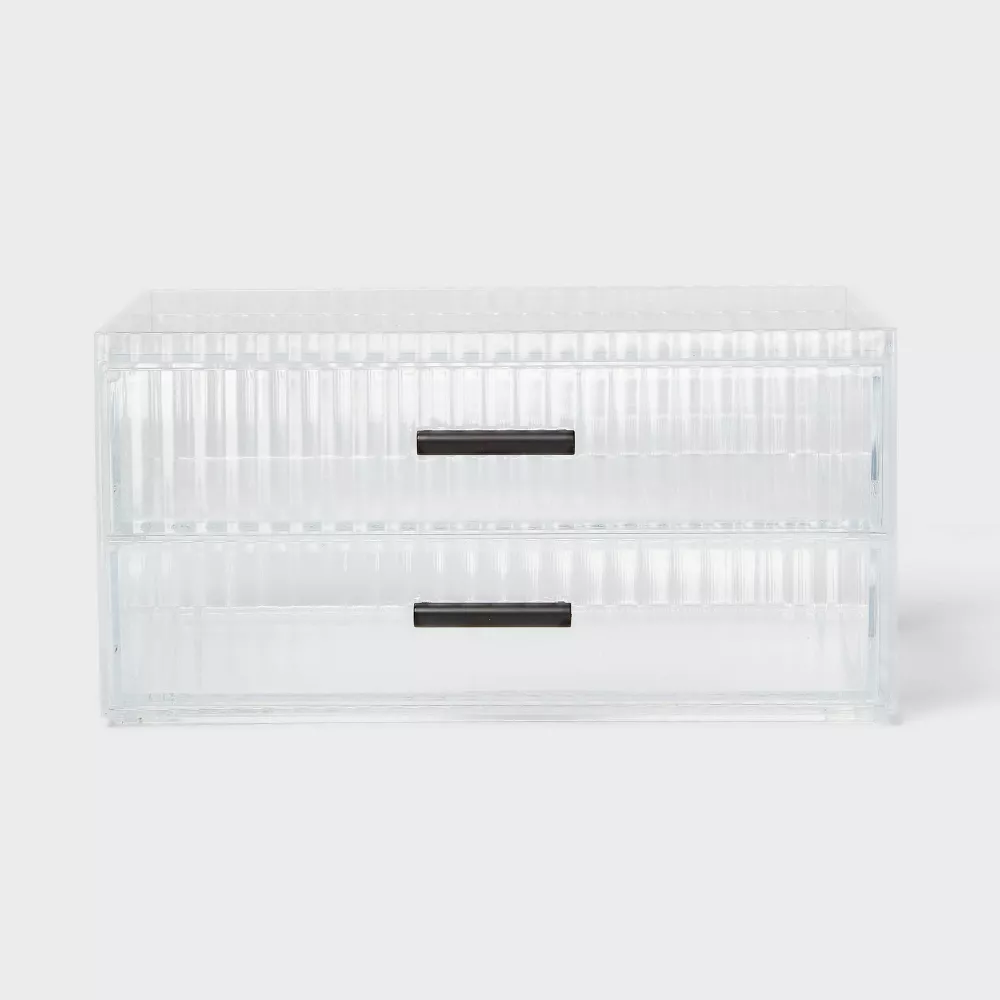 Whether you're setting up a new vanity or want to add a space-saving storage solution to your bathroom, you'll love the Clear Ribbed Acrylic Stacking Drawers from Threshold™. These stacking drawers includes two drawers with a ribbed design for a classic look you'll love, and the clear design lets you easily see the contents. Made of acrylic, these ribbed drawers come complete with built-in handles for easy opening and closing.