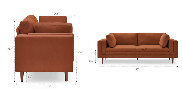 This mid-century sofa has enough space to seat three people and brings a sleek, streamlined look to your living room. It features an engineered wood frame that rests on solid wood corner block feet. Wrapped in high quality fabric including corduroy and linen blend in a fashion hue of your choice, this couch is also filled with foam, polyester, and coil springs for a balance of padding and stability: square arms and a cushion back round out this classic design. Two toss pillows are also included with this sofa. Easy to assemble and perfect size for your room.