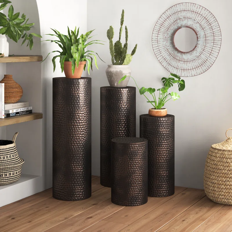 A practical yet stylish upgrade that instantly elevate the look of your room. Display your plants, decor or your favorite art piece on this beautifully crafted pedestal table. Add these small accent tables to the side of your upholstered linen sofa with some bold colored pillows for a whimsical look. This item ships in 1 carton. Suitable for indoor use only. Maximum weight limit is 25 lbs. Made in India. This brown colored drink table comes as a set of 4. Industrial style.