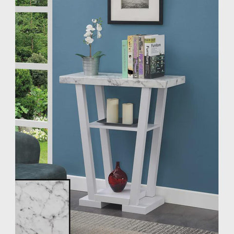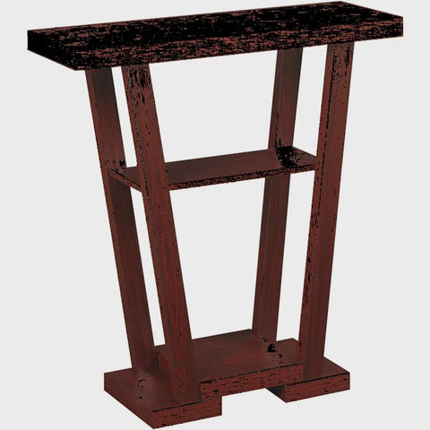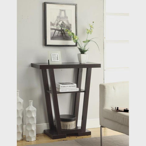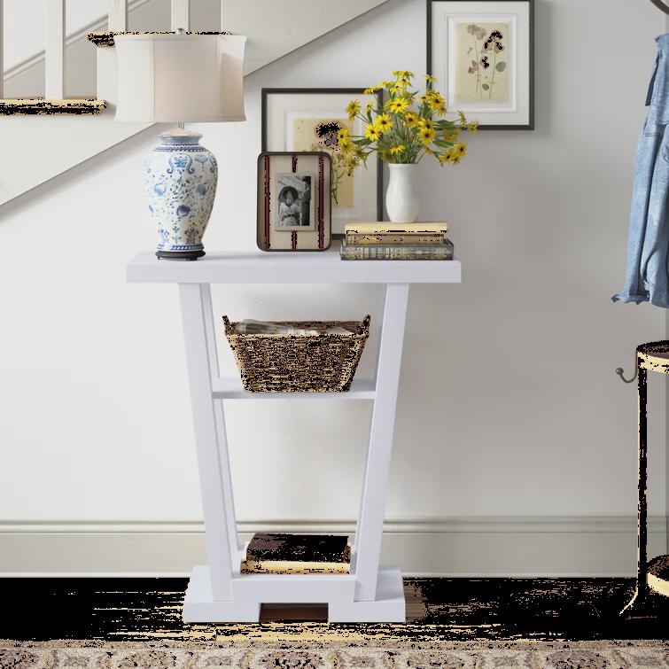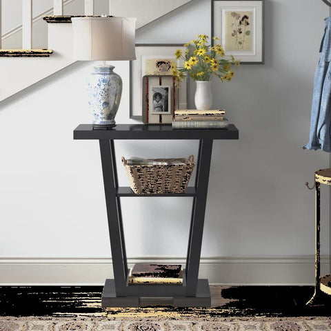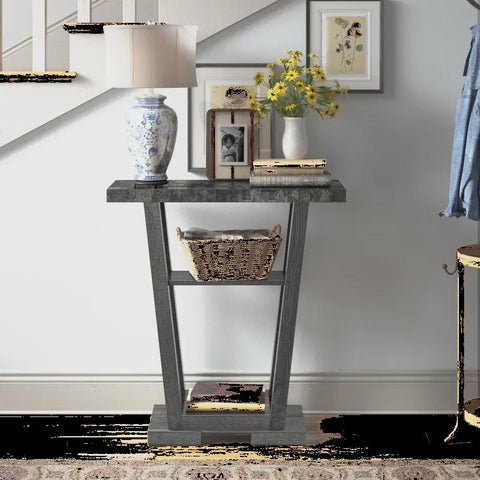 Add elegance to your living space with the Carce 31.5" Console Table with Shelves. This sleek design was made to add sophistication to any entryway, living room, hallway, or dining room. Display decor or collectibles on the tabletop while the bottom shelf holds a vase or plant. The V-lined silhouette gives this piece a sharp look while showcasing a lovely woodgrain finish. Crafted from MDF, particle board and melamine, this table was engineered for durability.