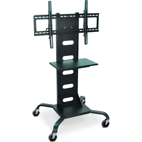 Stands strong. Moves easily. Built with an all-steel frame, black powder coat finish, sturdy curved legs and lockable rolling casters, the Luxor Flat Panel TV Stand and Mount is a strong monitor stand with a simple style that's just right for classrooms, boardrooms, trade shows and libraries. It can hold a monitor ranging from 37" to 60" in size and offers continuous touch tilt of 15 degrees up or down. It also features an integrated cable management system and an adjustable equipment shelf that can be positioned from 25" to 40" high.