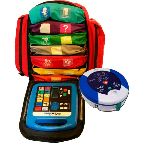 Backpack SET FV4101x has a clear AED-viewing pocket, color-coded Zipper bags and 2 side pockets and patented first aid technology, Emergency Instruction Device (EID) by First Voice. FV4199x upgrade of FV4101x also Includes HS01x AED package.