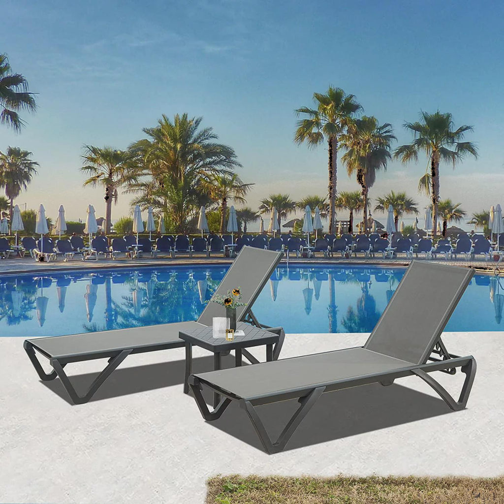 Lounge Chairs Set of 3, Aluminum Pool Chaise Lounge with Side Table,5 Position Adjustable Backrest and Wheels, All Weather Outdoor Lounge Chairs