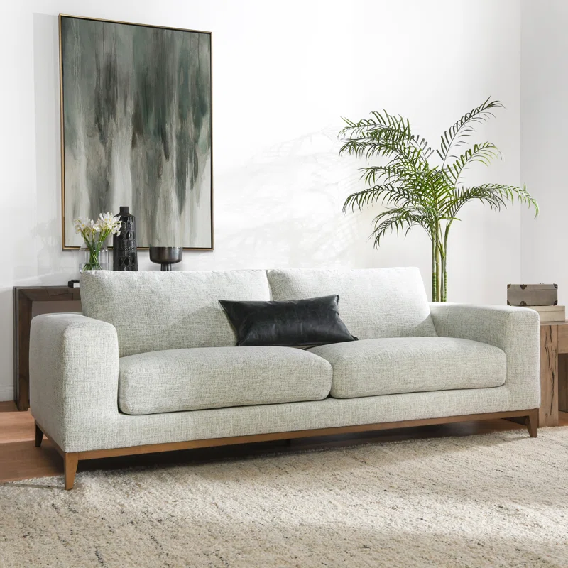 Linen-like textured upholstery and a solid oak frame lend a classic feel to this handsome sofa, making it an ideal complement to most styles. The neutral upholstery contrasts with the warm shade of oak wood while tapered legs add visual interest.