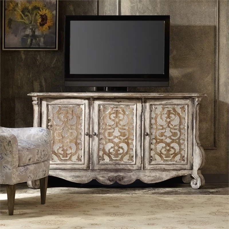 Elevate your entertainment in livable luxury. The timeless Chatelet Entertainment Console features 3 mirrored fretwork doors, a scalloped base and the soft amber Caramel Froth finish. The accent finish is Paris Vintage, a distressed white with fretwork overlay. The antique mirror behind the fretwork is removable. Behind each door are two adjustable shelves. One three-plug outlet. Accommodates up to a 65-inch TV.