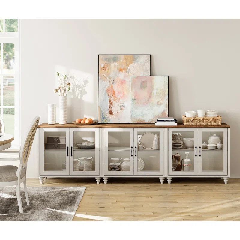 This warm and rustic sideboard adds stylish storage to your dining room or living area. Crafted from engineered wood with a distressed finish, its elongated, rectangular frame features six doors with transparent tempered glass panels, making it easy to locate your items. The interior includes adjustable shelves, allowing you to customize the storage space to fit your needs. Its solid and engineered wood countertop adds a practical surface for serving appetizers, creating a coffee station, or displaying decor. Sleek, black-finished hardware and round gourd legs complete the modern farmhouse look.