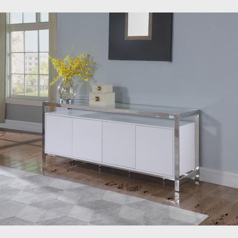 This modern sideboard brings a sleek, stylish touch to your dining area or living room. The white gloss cabinet features four doors with silver accents, each opening to individual storage compartments with shelves. We love the glass countertop, which adds a touch of sophistication to this functional piece. Its cool tones contrast beautifully with the clean white, making it an eye-catching addition to your home. With a weight capacity of 350 lbs., this sideboard is designed for residential use and includes a tip-over restraint device for added safety.