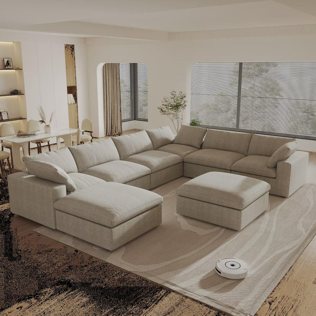 Inspired by floating clouds, WJShome collection offers classic comfort with a creative modular design. Crafted with natural linen fabrics for skin-friendly, breathable, and durable qualities, it provides a haven for cozy relaxation. Featuring a clean-lined design and wide seat depth, those sectional sofas include premium down feather cushions for a feeling of relaxation and calming comfort while lounging, making it the perfect addition to your living room, family room, or game room.