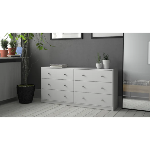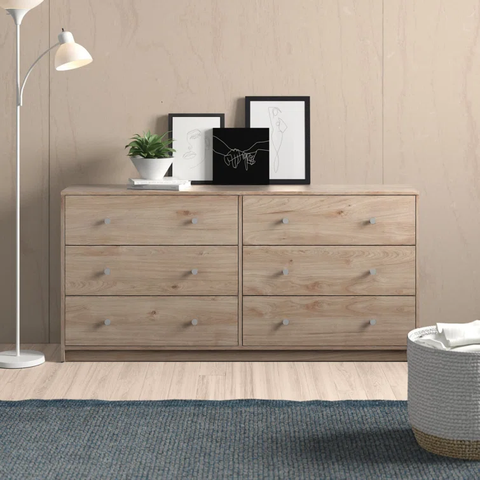 This 6-drawer double dresser elevates your bedroom with a sleek, modern design and storage. It's crafted from engineered wood with a low, wide silhouette. The six drawers feature metal slide glides and give you room for organizing and storing your wardrobe. We love the drawer pulls with a pewter look for the finishing contemporary touch. Plus, the top surface provides a great place for displaying houseplants and décor. A wall anchor is included for extra stability. New and improved packaging.