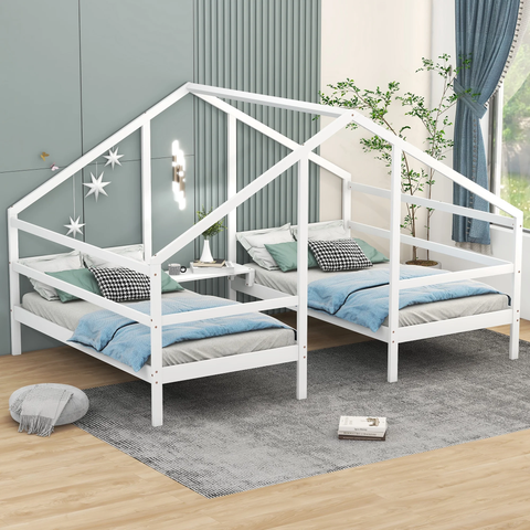 Euroco Wood House Twin Bed, Two Beds in One with Movable Desk